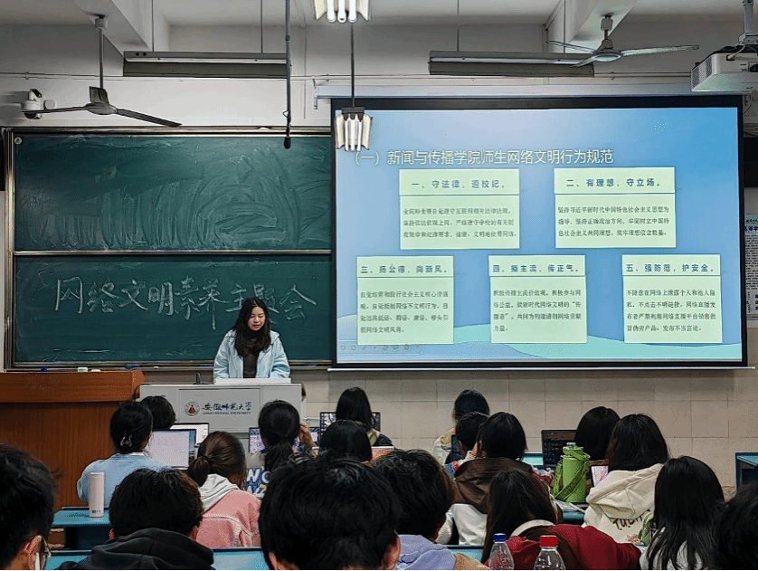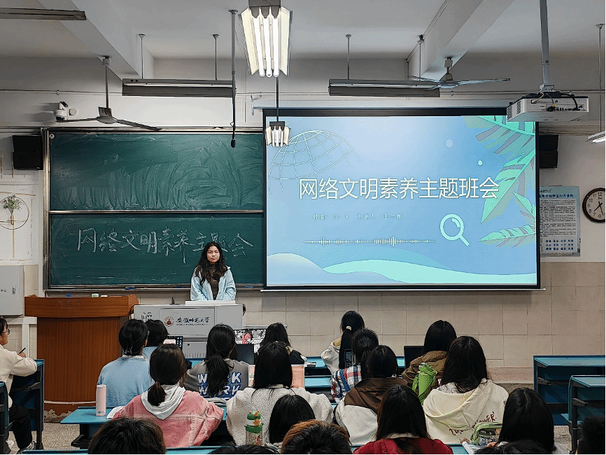 为进一步提升同学们的网络文明素养水平,帮助同学们在真假难辨、事实反转的网络世界中安全、绿色上网,2023级网络与新媒体专业于2023年11月9日晚7点在2040304教室召开网络文明素养主题班会。此次班会由团支书王一彤主讲,23级网络与新媒体专业全体同学到场参会。
