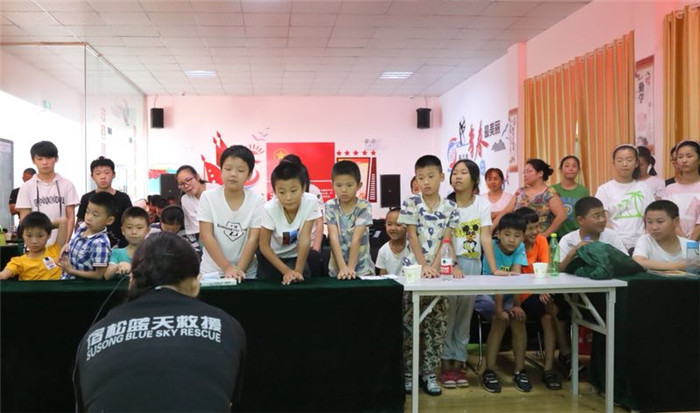 蓝天救援队的队长陈腊保给同学们讲解了一些预防溺水的安全小常识,如“四不”、“六不准”等等。同学们一边聆听,一边记着笔记。救援队队员现场为同学们示范了人工呼吸的正确做法,包括大声呼救、电话求救、判断呼吸、轻拍双肩,双手按压等内容。同学们主动举手上台展示自己的学习成果,与队员们互动,现场模拟救援。