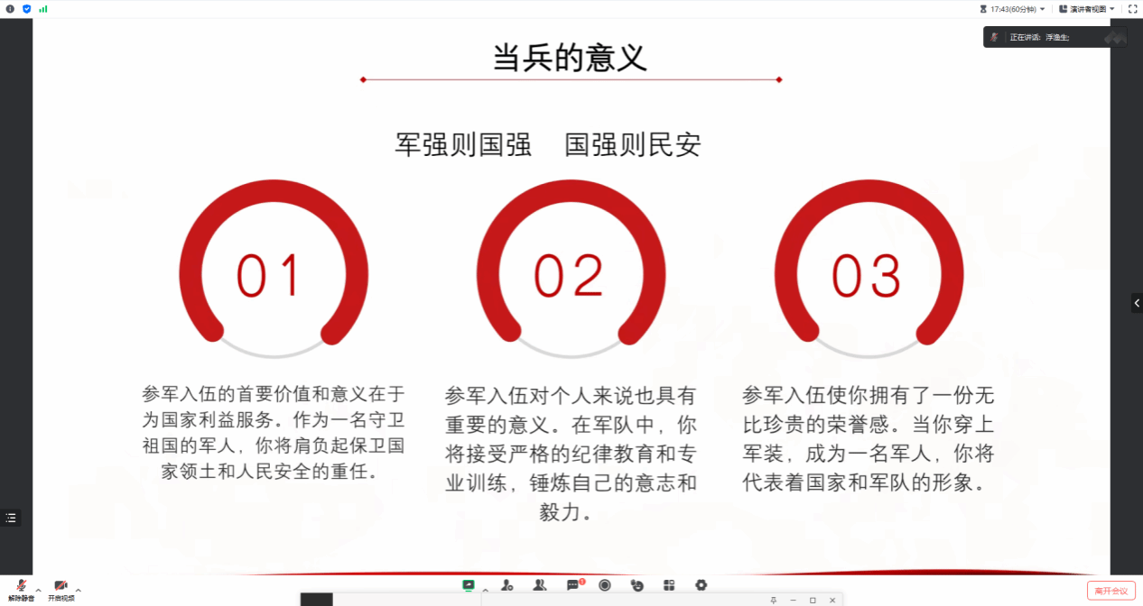 退伍军人、原2020级摄影专业员工冯乐乐以PPT的形式向同学们介绍了自己亲身经历,强调“军强则国强、国强则民安”。参军入伍的首要价值和意义在于为国家利益服务,接受严格的纪律教育和专业训练,锤炼自己的意志品质。他分别从当兵的好处、应征入伍的基本流程和退伍士兵的优惠政策向同学们进行介绍,围绕老员工参军入伍的优待待遇、资助办法、考研升学以及退役就业服务政策等多方面向同学们进行介绍。