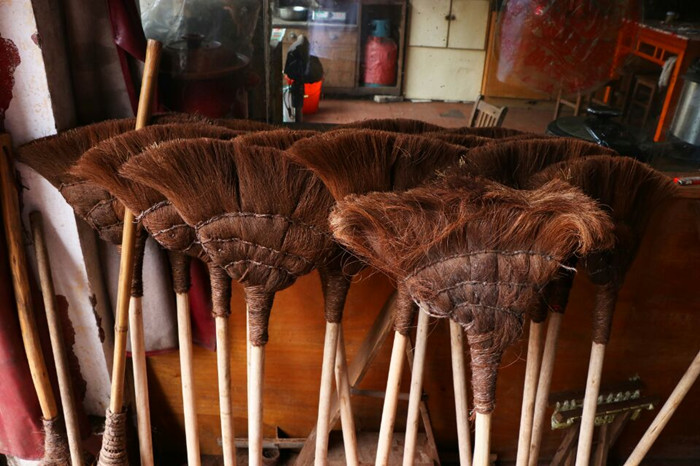 用棕榈树所剥取的棕皮纤维(叶鞘纤维)为原料,俗称棕片、棕丝,由棕匠将其编制成蓑衣、棕绳、棕刷等棕制品。“这个编制的过程十分复杂,用时也长,相比于这个,人们还是倾向于购买市面上那些塑料制品,便宜成本低。”棕匠的儿子洪志坚说,“这门手艺听我父亲说已经传了三代了,曾经我的祖上就是靠着这门手艺来养活了一家人,如今随着时代的变迁,购买的人在逐年减少,就像我前面说的,市场竞争力小,加上我有自己的兴趣志不在此,所以我们正在准备着将这门手艺申请非物质文化遗产。”
