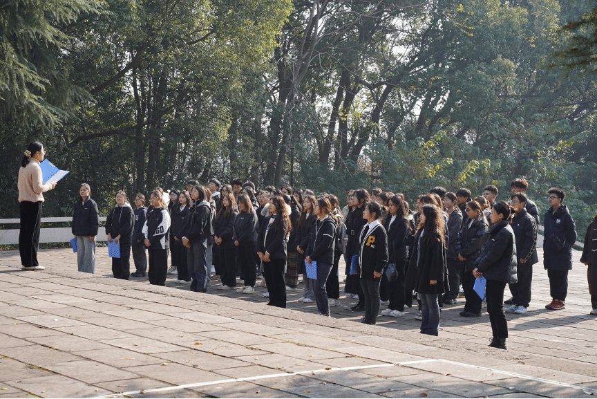 之后,同学们在纪念碑凭吊区列队进行主题仪式。同学们两两一组依次到纪念碑前献花、鞠躬,随后全体面对纪念碑默哀。团支书王一彤带领全体同学面对团旗重温入团誓词。江锦怡、李容、方中华、宋予四位同学朗诵《红船,从南湖起航》,其深厚的爱党爱国情怀鼓舞着现场同学。员工代表吴家欣、张梦梦、刘怡辰依次发言,分别从“信仰的力量”、“总结参观所学”、“缅怀英烈,抚今追昔”的角度进行感悟交流。