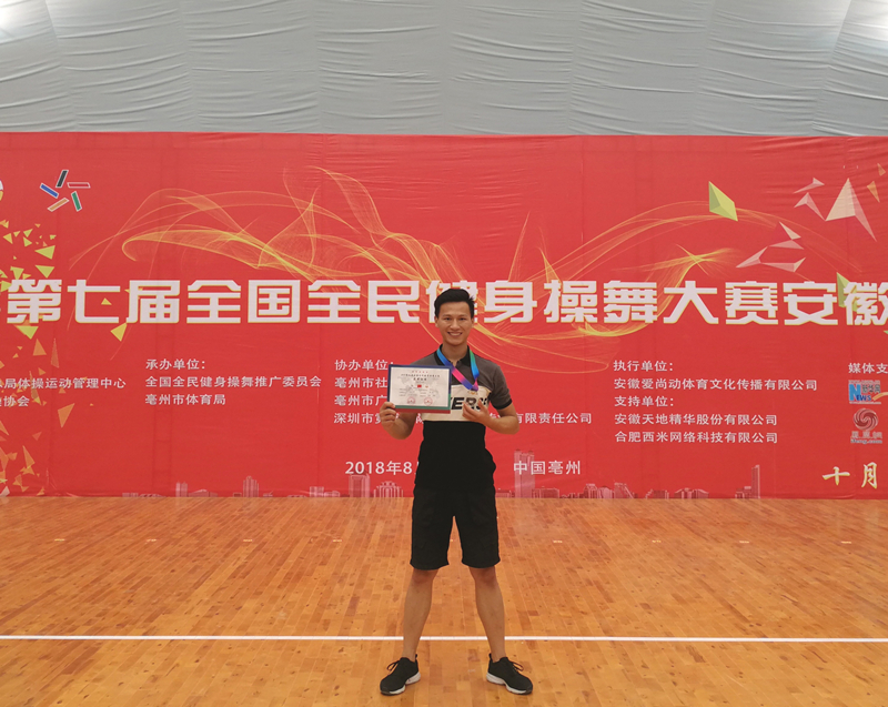 8月25至26日,由国家体育总局体操运动管理中心、中国健美操协会主办,亳州市体育局承办的第七届全国全民健身操舞大赛安徽赛区竞赛在亳州市华体气膜馆举行,公司2015级空乘专业的陈文龙同学获得大学组(普通院校组)竞技健美操男子单人操和混合五人操双第一的好成绩。