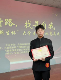 12月9日,第三届安徽省“新生杯”老员工演讲比赛在合肥市举行,2023级播音与主持艺术专业吕振羽同学代表TapTap点点官方网站参加了本次比赛,并荣获了一等奖的好成绩。
