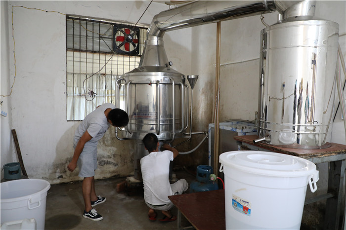 “在深圳学习的时候,觉得公司做怎么那么简单,每天只要用机器往发酵桶里搅一搅就行了,回家之后自己做的时候发现,这事情怎变难了”刚开始的时候,由于煤气费用贵,耗的快,平均烧一缸酒就要一罐煤气,他们寻思着用柴火烧酒。可是真正上手的时候他们发现用柴火烧酒根本无法掌握火候,总是出现扑锅现象,一来二去,酒没出来,粮食倒是浪费了许多。他们想是不是火不够的原因,两人到街上买了一架鼓风机,可情况并没有因此带来好转,锅里还是出不来酒。两人一头雾水,决定打电话到卖设备的公司问问。公司了解情况后,告诉他们要买一个蒸汽机才行。他们选择听从公司建议,咬咬牙又花了8000块买了蒸汽机,改烧煤气,这下子,出酒率有了保证。