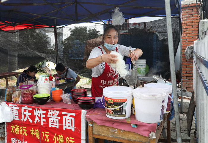 凌晨3点,杜文平起床熬上当天的汤,将物料搬上电动三轮;4点,杜文平的红色三轮隐没在黑暗里,在一片狗吠中摇摇晃晃地驶向城东汽车站,不下半小时,一个精致利落的早餐摊便出现在蒙蒙亮的街边,等待它第一个客人的到来。几平方米的小空间里溢出满满的重庆味道,炸酱面、酸辣粉、小馄饨等正宗的重庆风味承载了丰峡村村民对那个水淹之城18年的怀念。
