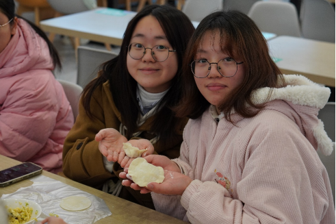 在碗筷叮咚碰撞声中,一个个形状新颖,模样可爱的饺子诞生了。太阳花型、包子型、烧卖型、元宝型等等,包裹着同学们的巧思与祝福。很快,十几袋饺子皮全部包完。在等待饺子出锅时,同学们纷纷在朋友圈发自己包的饺子的照片,表示自己包自己吃别有一番风味!