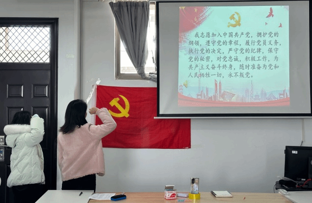 紧接着,按照会议流程,预备党员余小泉同志进行宣誓,沈超颖作为领誓人,带领余小泉面向党旗,佩戴党员徽章庄严宣誓,誓词声声入耳,铿锵有力。余小泉也向大会汇报预备期间的思想、工作、学习情况,总结自身缺点和不足,表明自己加入中国共产党的态度和决心,未来将继续努力,充分发挥党员的先锋模范作用。