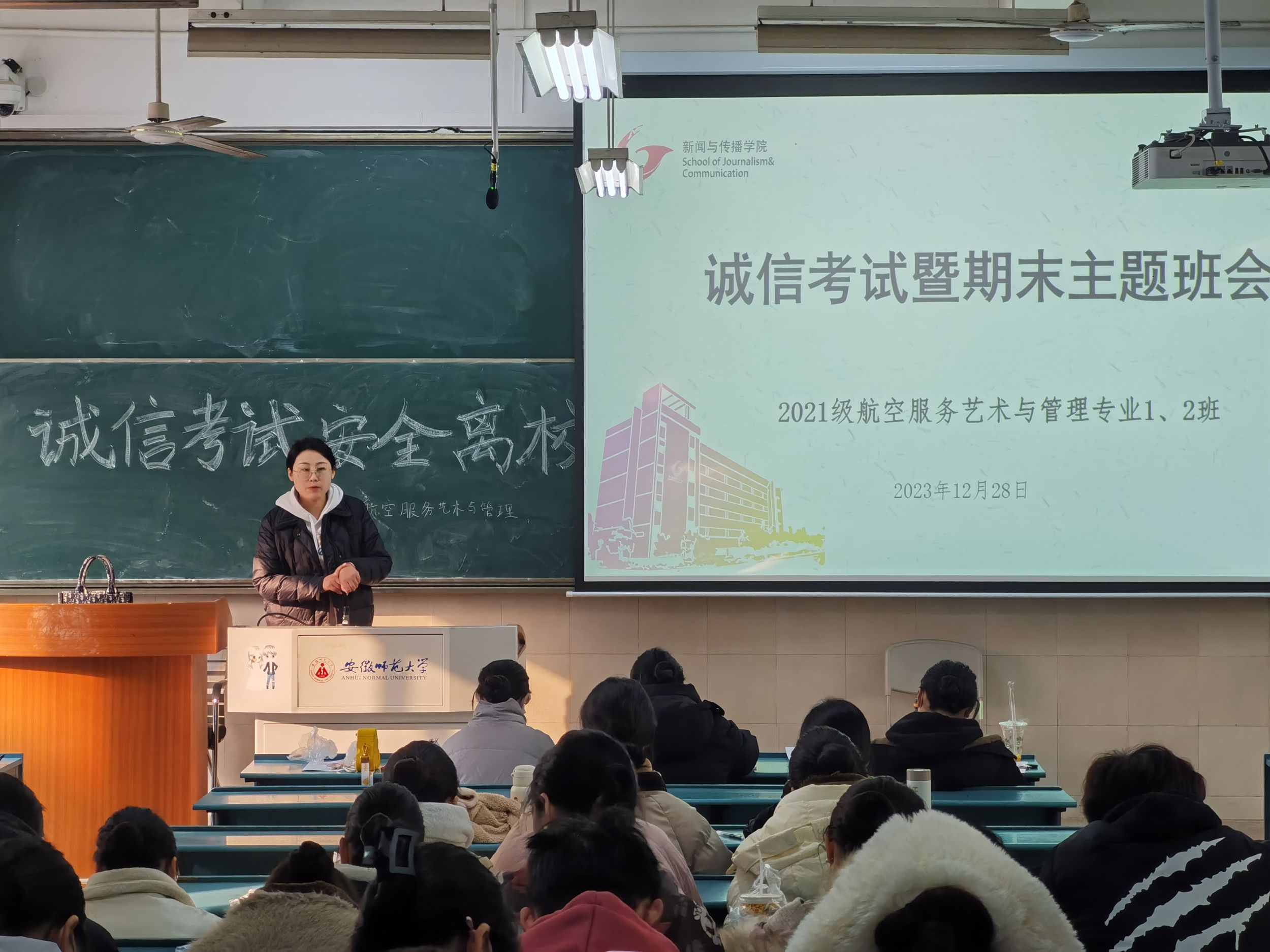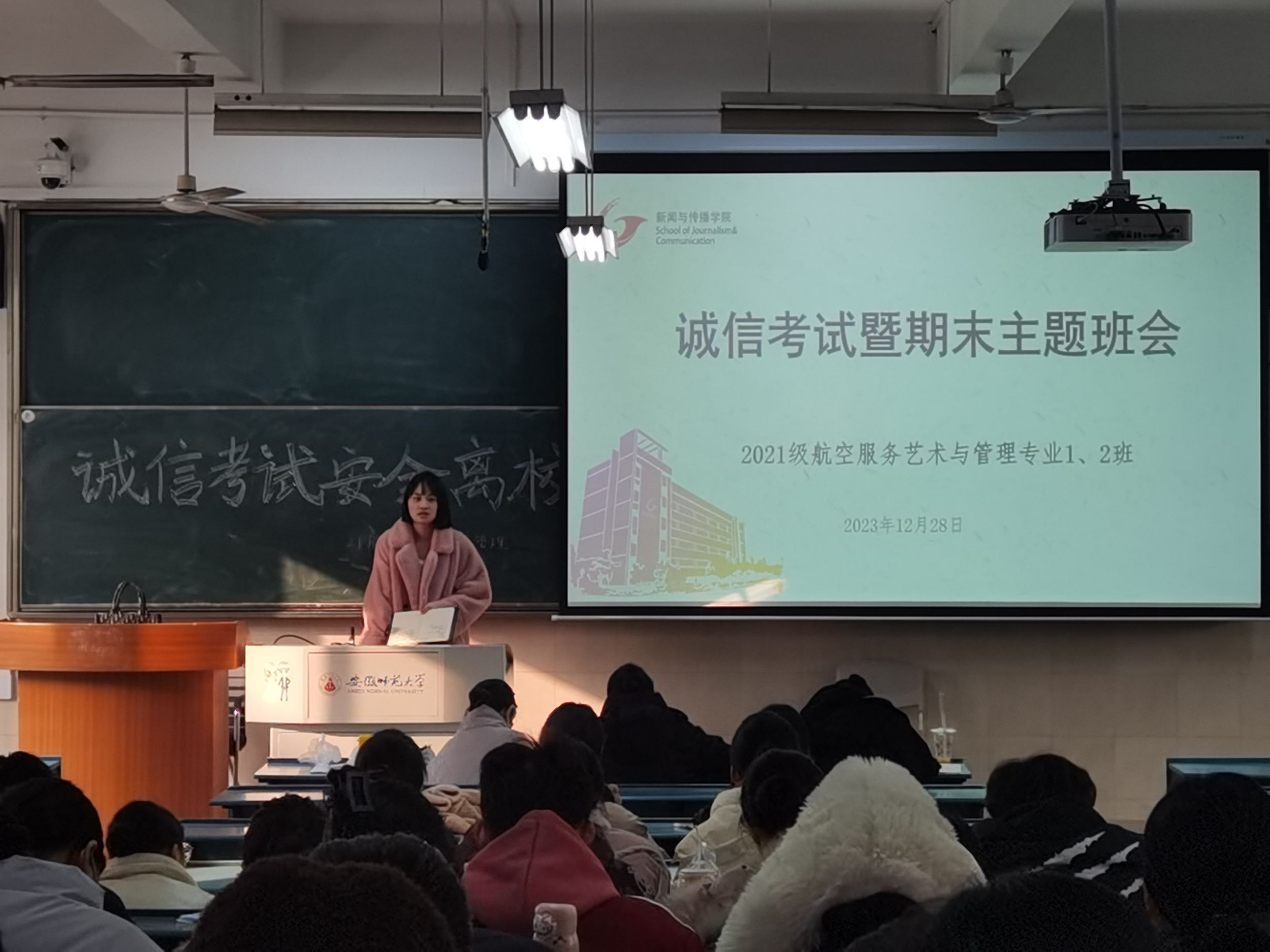 为进一步规范同学们诚信考试意识,提醒安全防范应落实到位,21航服1、2班于12月28日上午在教学楼2040304召开了诚信考试暨期末主题班会。辅导员张雁主持,生活辅导员俞应芬和全体同学参会。