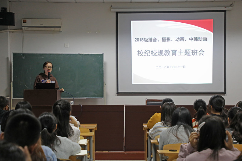为加强新生校史校情的学习,培养遵规守纪意识,养成文明健康的行为习惯,进一步形成优良校风、学风,2018级播音、摄影、动画(含中韩动画)专业在公司四楼会议室召开校规校纪教育主题班会,四个专业全体员工参加,由辅导员孙月婷主持。