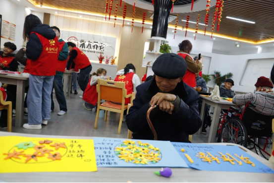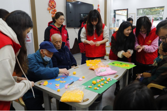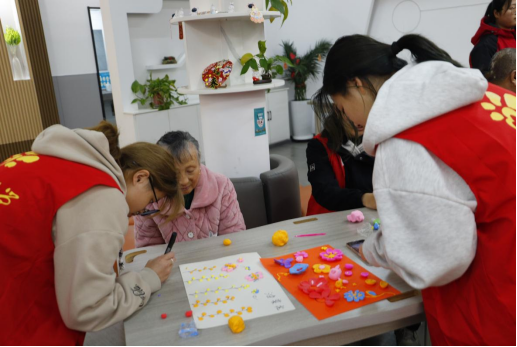 然后,志愿者们与爷爷奶奶们一起动手实践,以做手工、做粘土画、画画等方式陪伴着爷爷奶奶们,向他们介绍各种玩法,表达着属于老员工的关心与温暖。爷爷奶奶们也颇认真地做着手工,并开心地向我们展示着成品!