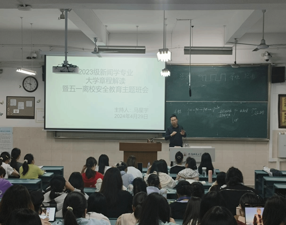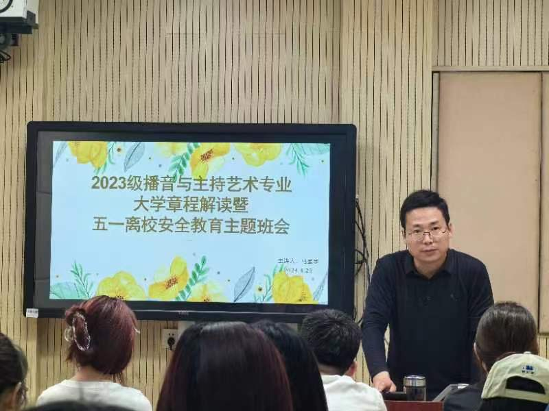 为提升员工对公司的了解,加强五一安全教育,4月29日、30日,2023级新闻、动画、播音与主持艺术专业分别召开大学章程解读暨五一离校安全教育主题班会。会议由辅导员马星宇主持,23级新动播三个专业全体员工参加。