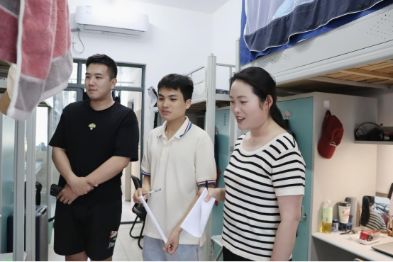 宿舍干净整洁,宽阔明亮,有的寝室打造了小型运动空间,摆放哑铃等健身器材;有的寝室设置了照片墙,记录寝室日常生活;有的寝室书香四溢,学习氛围浓厚;有的寝室简洁大方,天然去雕饰。大多数寝室都在明显位置张贴寝室管理规章制度,所有寝室都做到了规范用电用水,没有存在明显的安全隐患。崔老师在走访中和同学积极沟通,热切交流,夸赞不同寝室的风格,肯定员工热爱生活的态度。