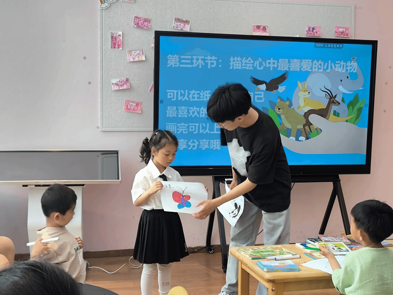 为大家科普完关于野生动物的知识后,小朋友们在老师和家长的帮助下拿起画笔,画出了自己最想保护的动物。王一鸣同学鼓励小朋友们积极拿起作品,站上讲台,为大家讲解自己的绘画作品,并为勇敢的小朋友们递上了小礼品。