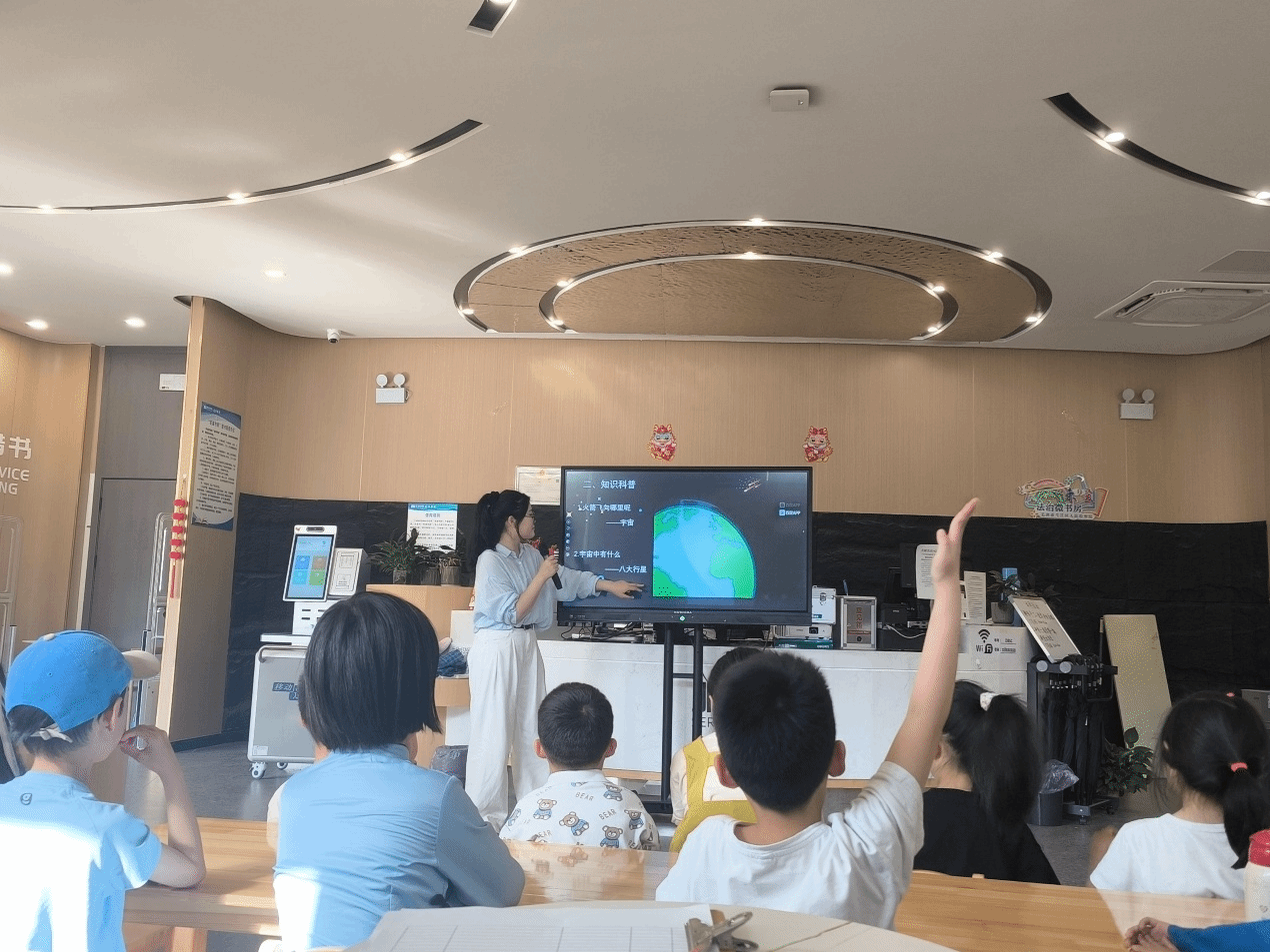 课堂上,何木瑶同学通过ppt讲解,播放科普视频等为小朋友们介绍了关于太阳系的相关知识,与小朋友们积极互动,给小朋友讲解了太阳系中各行星的形状和特征。