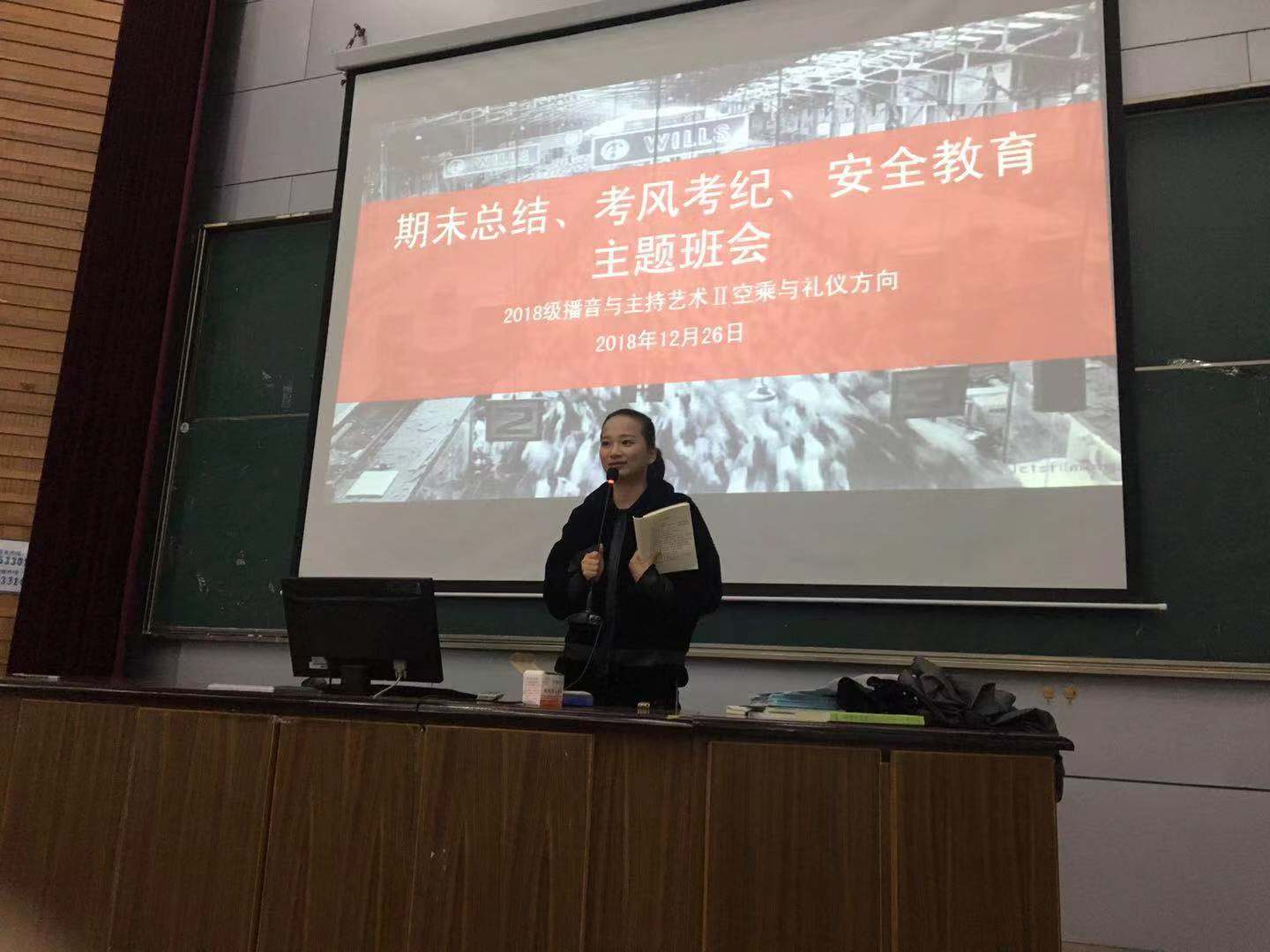期末考试和寒假即将来临,为认真贯彻公司有关期末考试和学期末的各项安全主题教育的工作要求。2018级空乘与礼仪专业于12月26日在教学楼2010105召开了严肃考风考纪,加强安全教育主题班会,会议由辅导员王旭老师主持,专业教师疏展参加了本次会议。