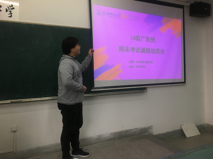 伴随期末考试的临近,12月27日下午,2016级广告学全体同学在2070502教室举办了“考风考纪教育”为内容的主题班会,意在强调诚信考试的重要性,本动员班会学习委员郭鑫主持。