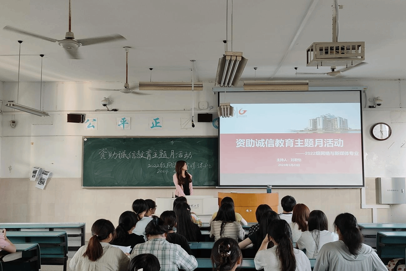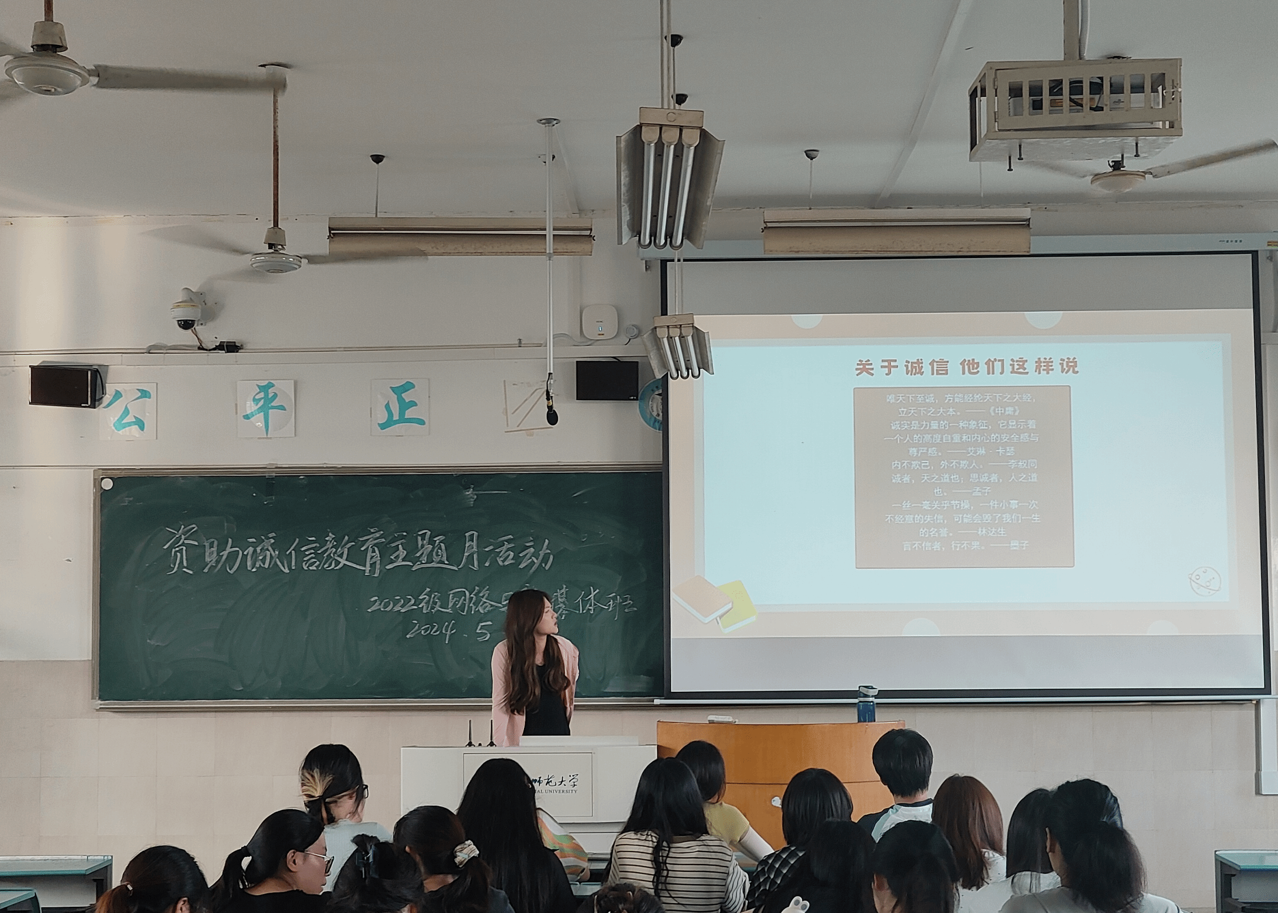 为加强诚信教育,增强同学们的诚信意识,2024年5月23日,2022级网络与新媒体专业于2020504教室召开了“资助诚信教育”主题班会。本次班会由学习委员刘君怡主持,2022级网络与新媒体专业全体同学参会。本次班会深入剖析了诚信的深刻内涵、警示失信行为的危害,并强调了诚信考试的重要价值。
