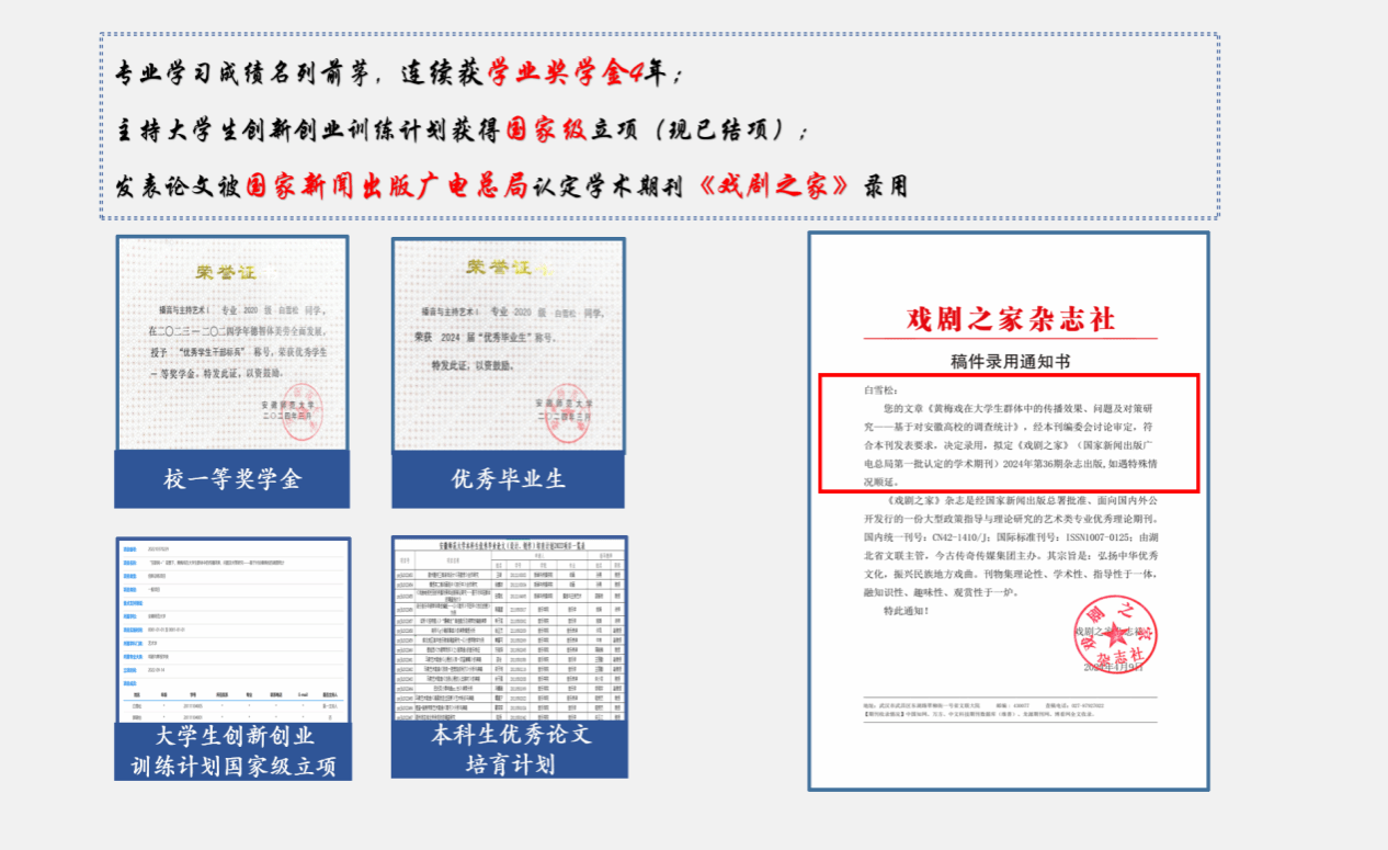 他注重打牢专业基底,在专业学习上孜孜以求。大学期间,他的专业成绩与综合测评成绩均位于专业前列,连续4年获评校优秀员工一、二等奖学金,获评校“优秀员工干部标兵”、“三好员工”等荣誉称号;主持老员工创新创业训练计划获得国家级立项(现已结项),申报课题入选校本科生优秀毕业论文培育计划,论文被国家新闻出版广电总局认定的学术期刊《戏剧之家》录用,以优异成绩入选校第26届研究生支教团、推免至TapTap点点官方网站。