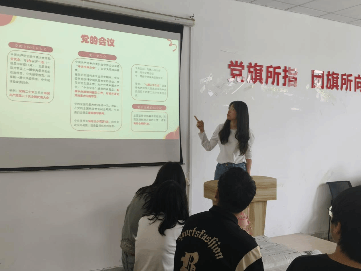 随后,新闻2班的于海涛对党的二十大的报道进行解读。首先,她先向同学们介绍了党和国家重大会议的召开时间和区别。接着,以2022年10月17日当天二十大的新闻报道为例,从位置安排、标题设计、图片使用、整体布局四个角度进行版面分析。她告诉同学们,报道的大标题要醒目以吸引读者注意力,小标题要凝练突出核心信息,图片大约在版面的中心位置,图像清晰、构图严谨,在下放表明来源,版面布局要平衡和谐,适当留白。最后,她总结说《中国青年报》对国内重大会议的报道中具有以文字为主、图片为辅;报道全面、重点突出;报道与时评结合、极具学习价值;仪式感强、模式化明显等特点。