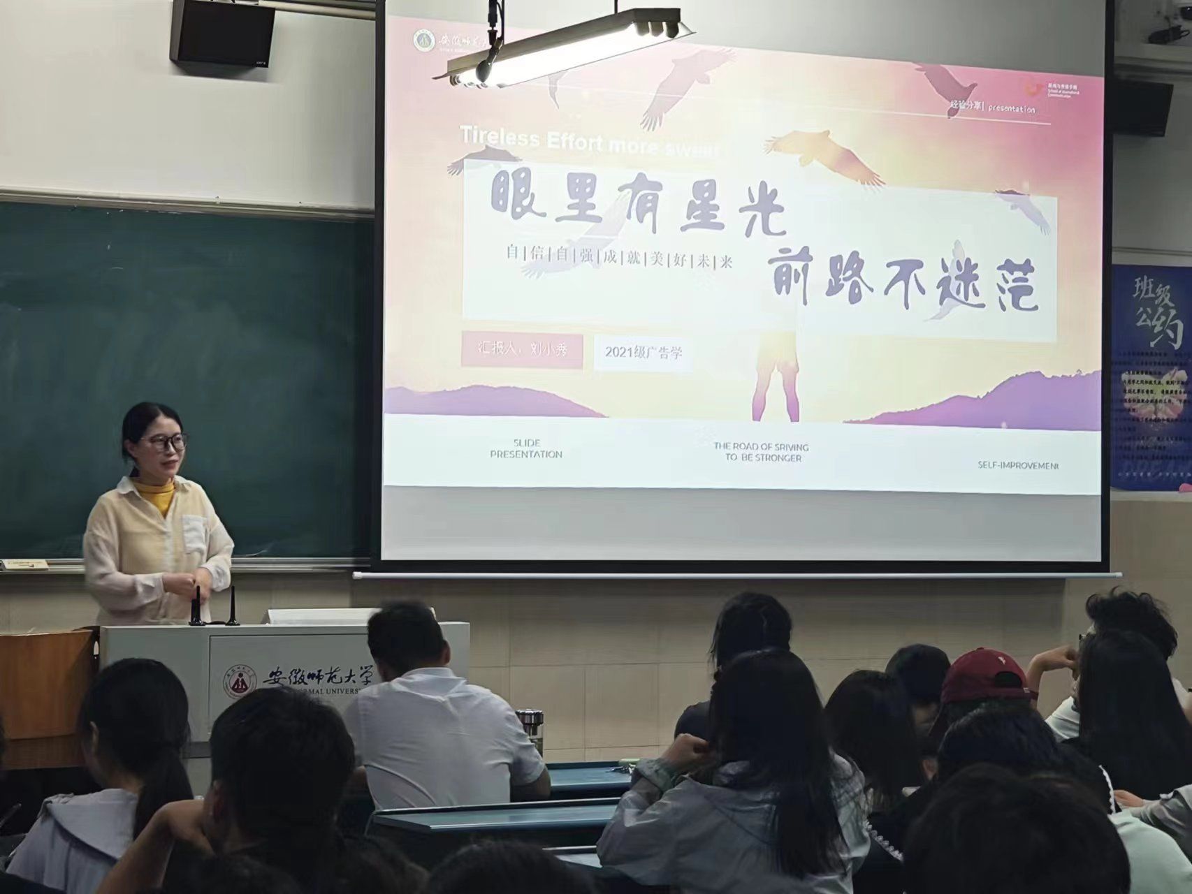 首先,马星宇邀请了校“自强之星”提名奖获得者2021级广告学专业的刘小秀作了题为“眼里有星光·前路不迷茫”的经验分享。她从个人经历、学习之路、工作经验、生活建议四个方面为进行了精彩的分享。她尤其提到,要注重科研,培养爱好,眼里有活,健康生活,积极参加各种比赛与活动,为保研和考研打下坚实基础。她还从自身亲身经历出发,道尽一路以来的坎坷,却从不放弃,不服输,不断地向上攀登。
