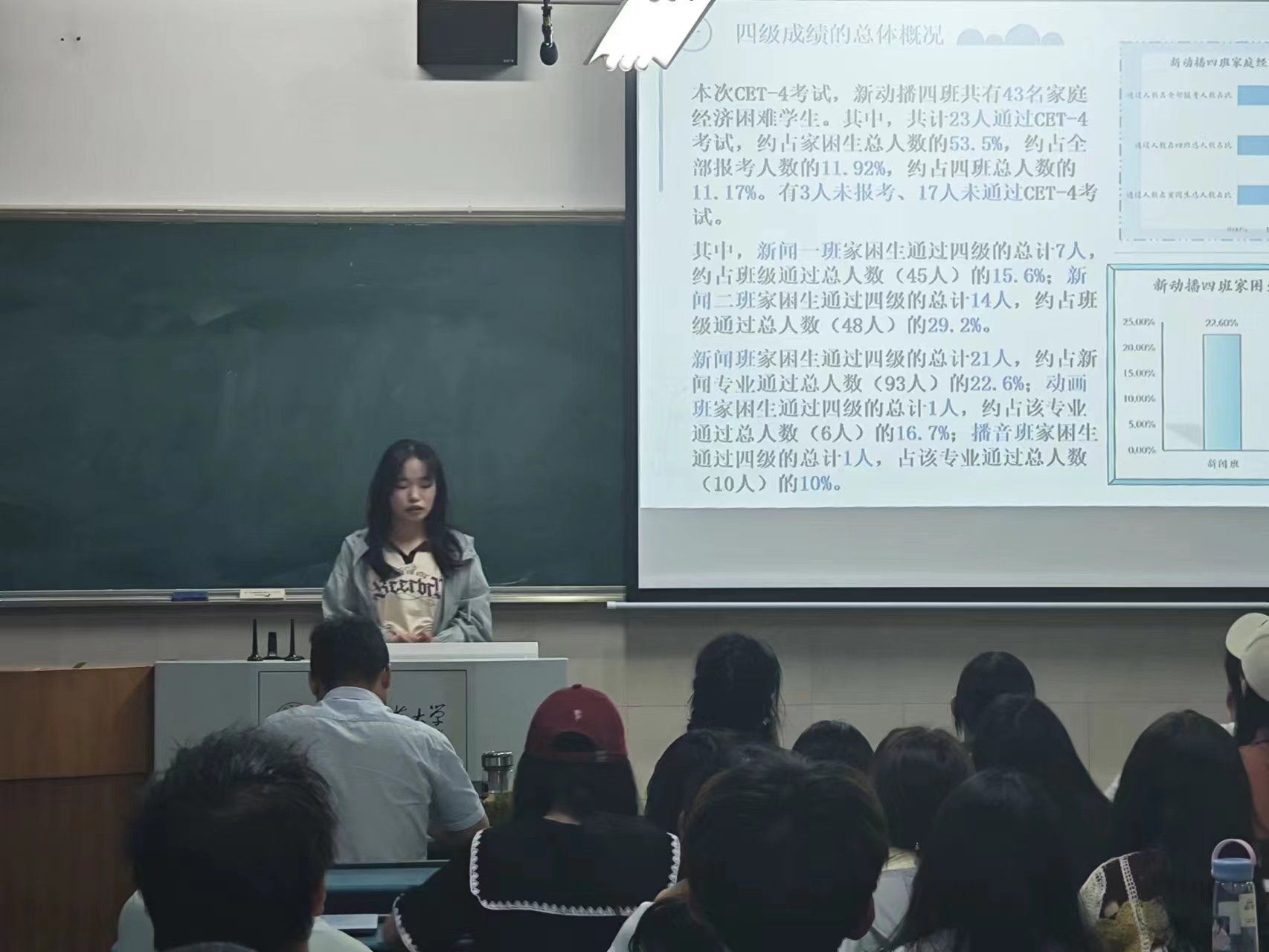马老师简单点评之后,由新闻1班的陈唐莲同学为我们带来了上学期英语四级成绩与期末成绩分析。陈唐莲同学以数据统计与图表的形式,向我们展示了新动播四个班英语四级通过情况,又详细地从听力阅读写作三个方面进行分析,指出薄弱所在,提出解决办法。还通过对大家上学期期末考试通过情况,绩点在班级以及专业中的排名进行了具体分析,对大家的学习情况起到了一定的督促作用。
