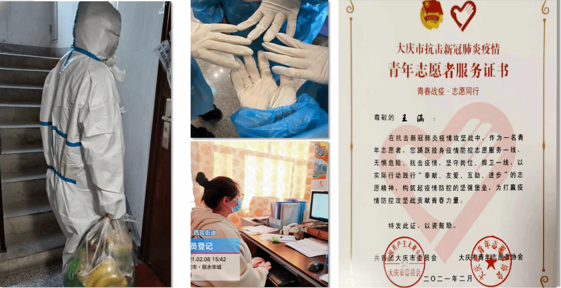 2021年的冬天,黑龙江省大庆市疫情肆虐,王涵返乡后便加到社区志愿服务队中,作为社区唯一的00后楼长为大家分发蔬菜、检测核酸。累积志愿服务时长300余小时,并收到了大庆团市委颁发的青年志愿者服务证书。在加入研究生支教团后,她也发挥专业所长参与组织第九届“温情安师大冬暖索玛花”暖冬行动,为活动制作海报、明信片并在食堂门口路演筹集善款,最终共收集1.7万元为西部需要帮助的孩子们购买过冬物资。