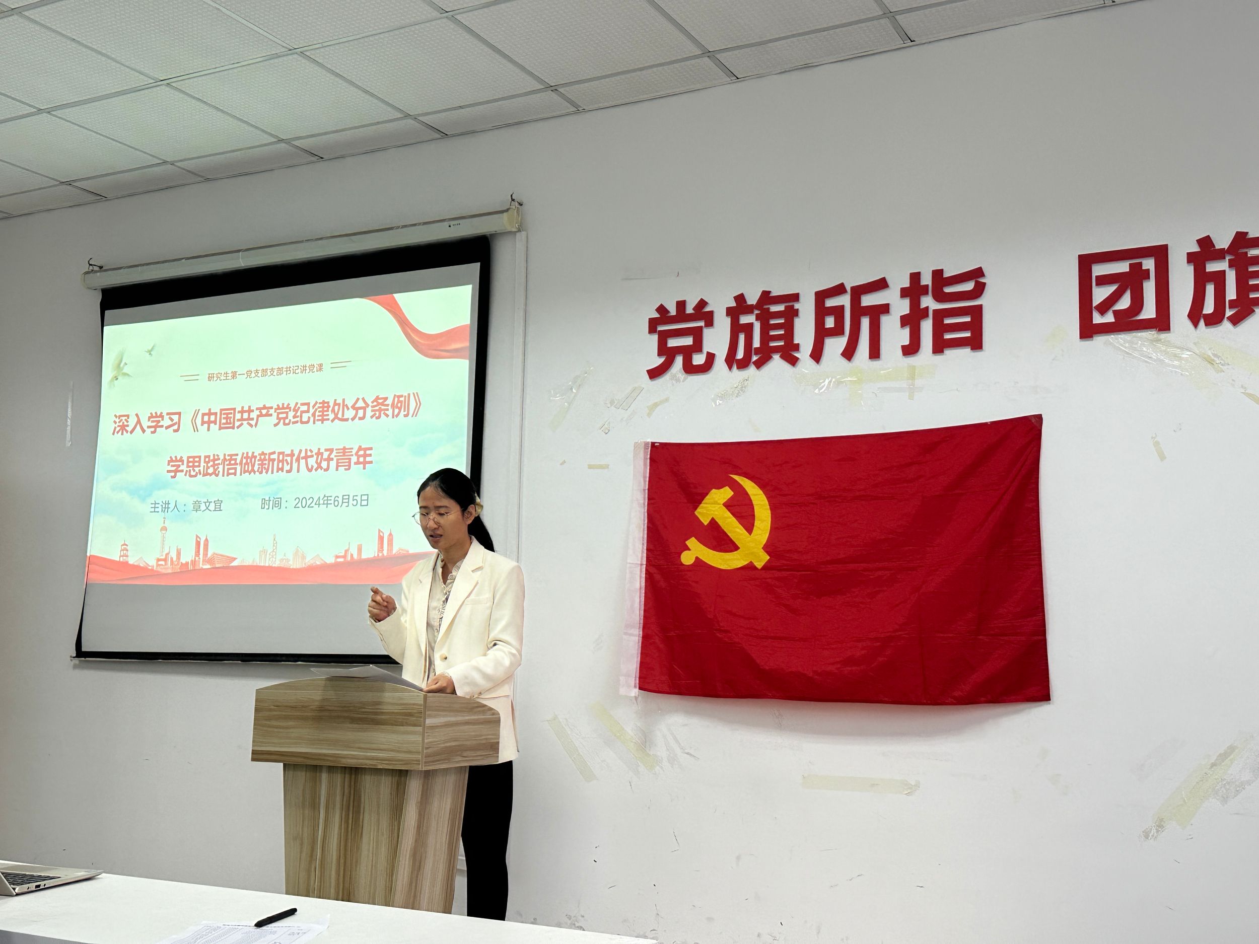 最后,赵昊对本次党纪学习教育进行了总结,并为党支部开展一次微党课。他着重强调了三点,其一是党员同志需深入学习和严格遵守纪律处分条例,这不仅是党员的职责所在,更是党员成长的必修课;其二作为研究生党员,应在工作、学习、生活中起到先锋模范作用,积极参与学科竞赛、科研活动等,带领其他同学一起争先创优;其三是希望毕业班党员们在未来的工作岗位上严守党员纪律,承担社会责任,以优秀党员的标准时刻要求自己。