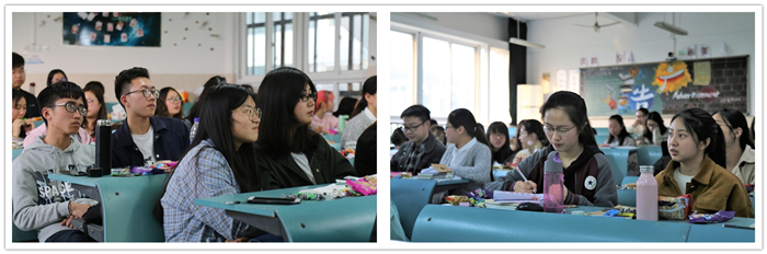 来妤婷先和大家分享了自己的专业学习经验。她用三首歌总结了自己的老员工活,《认真的“学”》强调的是学习的重要性,学习不仅是专业学习,还有特长和专长。《体面》指的是老员工要注意自身的形象问题,不仅是着装得体,个人谈吐也要体面。《刚好遇见你》,近朱者赤,她说“上进心是会传染的,一段真挚的友情会促进双方共同进步。”最后,她用一首《野蛮生长》祝福在座同学可以在大学收获一个不断成长的自己。