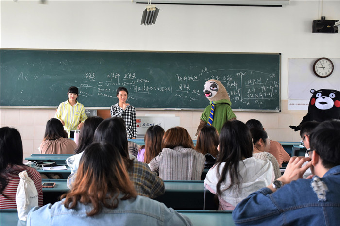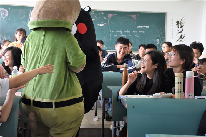 在15级广告学专业的课间中,玩偶因其胖胖的身材而夹在教室桌椅间的狭窄过道里,其不断扭动挣脱的姿势逗笑了所有人。在同学们的欢声笑语里,“舞动课间·欢乐青春”活动终于顺利完成了。活动每去到一个班级都会给一个班级的同学们带去欢笑,同学们还将现场拍摄的照片和短视频发布在社交媒体上,当活动去到17级新闻学(中英合作)的课间时,任课老师朱晓凯正在教室和同学们一起休息,他也将活动照片发在了朋友圈,将歌声、音乐声、欢笑声分享给了更多的人。
