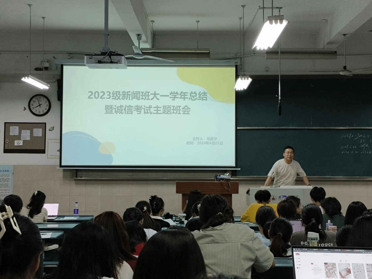 临近期末,为总结过去,展望未来,6月25日晚,2023级新闻学专业于行知楼2050302召开大一学年总结暨诚信应考主题班会,会议由辅导员马星宇主持,23级新闻班全体同学参加。