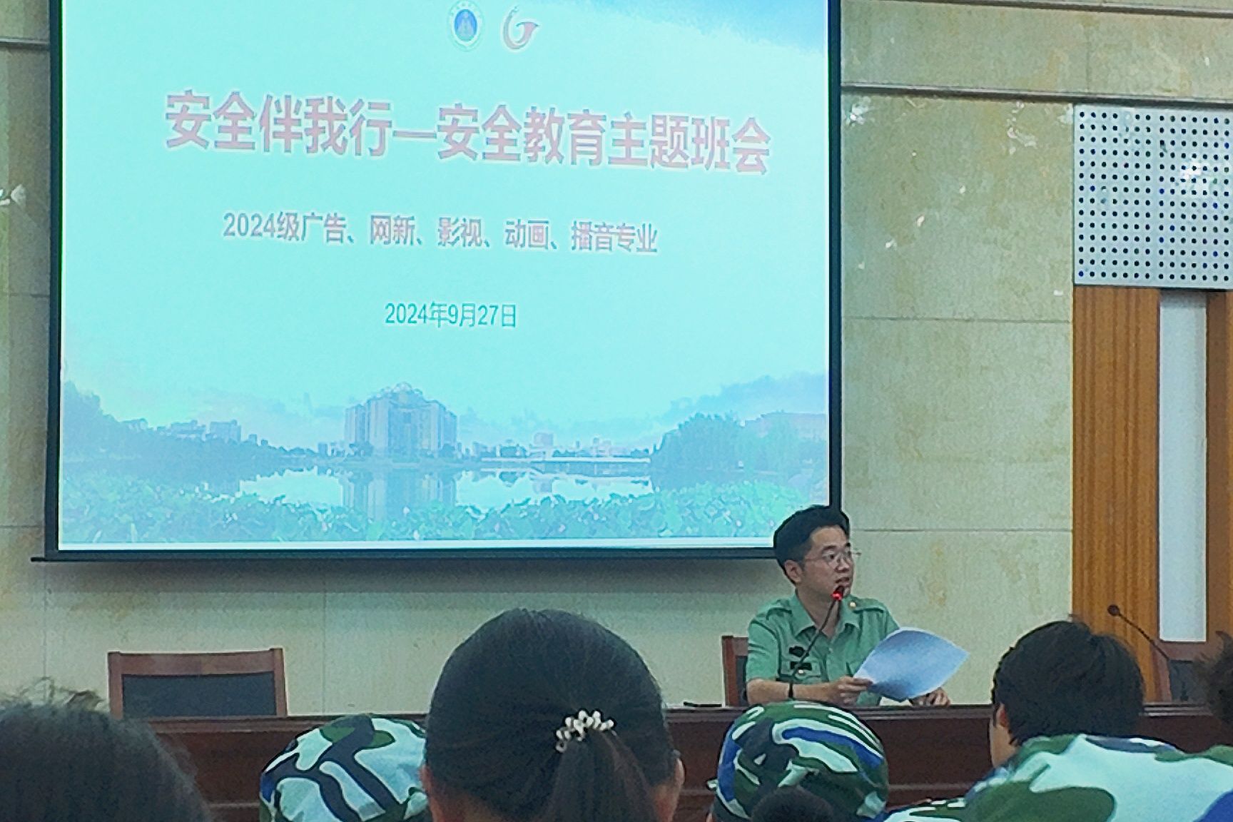 为提升员工安全意识,促进员工健康成长。9月27日晚,在学苑北楼8号楼二楼报告厅,2024年广告学、网络与新媒体、影视摄影与制作、动画、播音与主持艺术专业组织召开了以“安全伴我行,共筑和谐校园”的安全教育主题班会,班会由辅导员王旭主持,全体同学参加会议,本次会议旨在增强同学的安全意识识和自我保护能力。