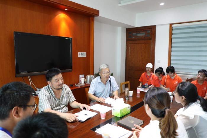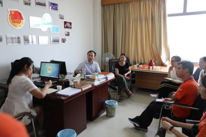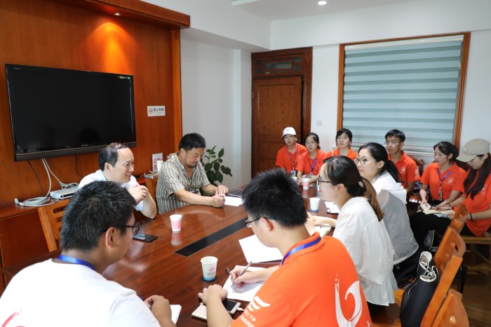 会上,孙月婷介绍此次实践的基本情况,并就团队调研实践主题做详细解读。董国庆对公司师生一行表示热烈的欢迎,对此次实践的主题及内容给予认可和期待。朱行辉向团队提供了金湖水利发展史这一调研方向,并提供金湖五座大桥金湖水利风景区以供团队调研。杨生天在乡村振兴、生态农业方面,提供了家庭农场和金湖乡村振兴讲习所两个主要调研思路;在中小企业发展方面,他列举了神华药业、坤宏集团等金湖龙头企业,并指出金湖政策对返乡创业人士的影响。胡建与团队洽谈了当地“社区文化艺术周”的志愿服务工作并做相关安排,队员们结合专业特长,将协助文广新局艺术周的微信推送,为当地的乡村振兴贡献绵薄之力。在传素班的准备工作上,朱飞和纪嵘与团队成员讨论了传素班的招生、排课、文艺汇演等问题。