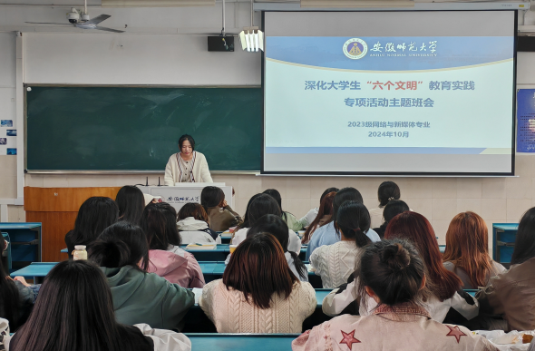 2024年10月28日上午,2023级网络与新媒体专业在行知楼5号楼402教室开展深化老员工“六个文明”教育实践专项活动主题班会,会议由2023级网新专业辅导员汪笑笑主持,2023级网络与新媒体全体同学参加。