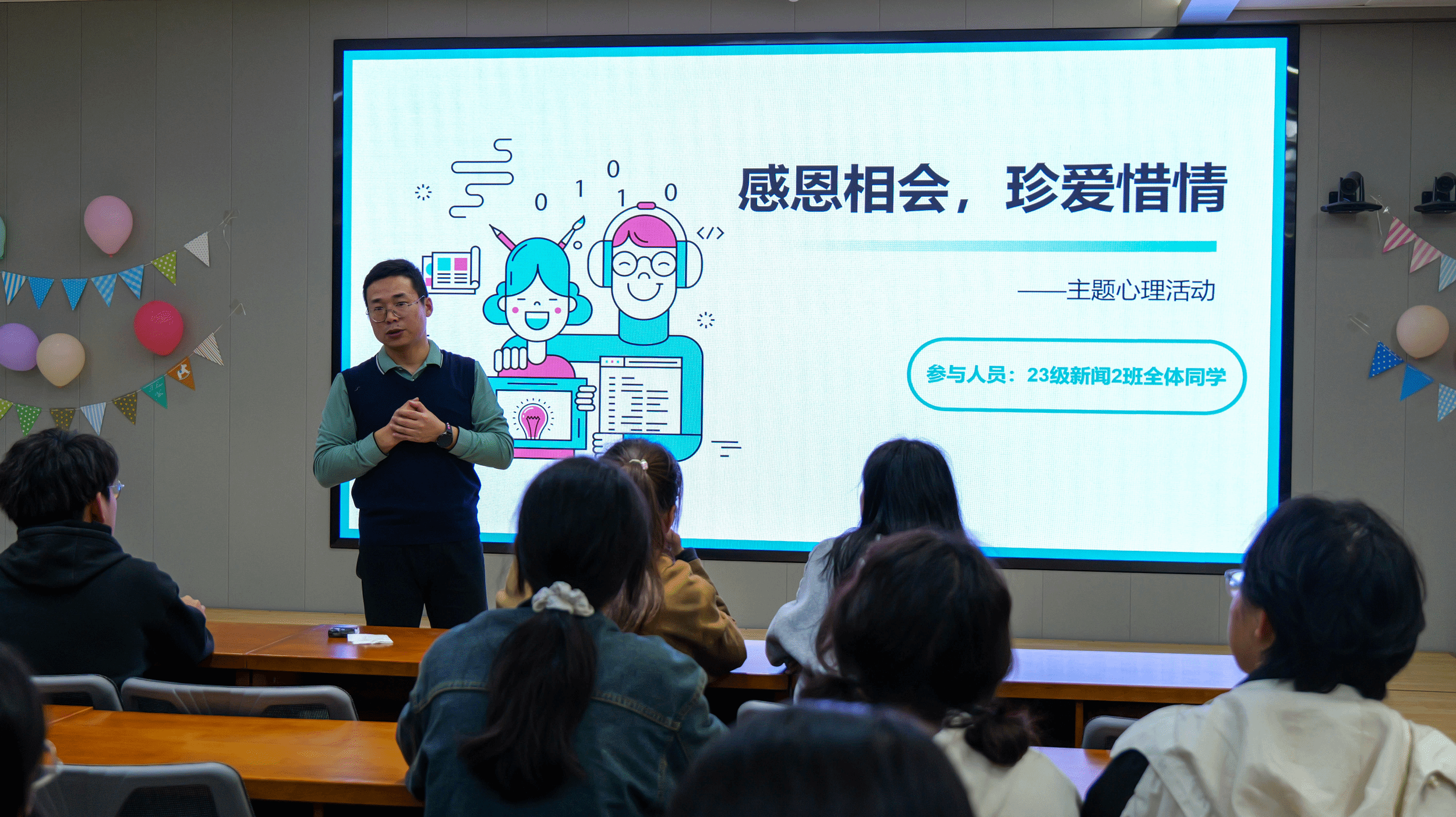 10月31日晚,2023级新闻2班“10·25”心理健康月主题活动开展,班级全体同学齐聚老员工活动中心员工之家,一场别开生面的心理活动节正悄然拉开。本次活动旨在通过一系列富有创意和意义的环节,引导同学们学会感恩,珍惜身边的人和事,并且也通过集体互动增进彼此间的了解和友谊。