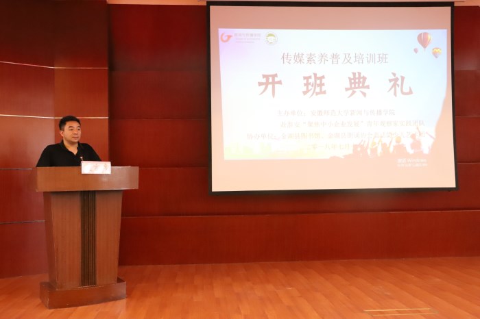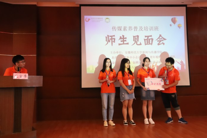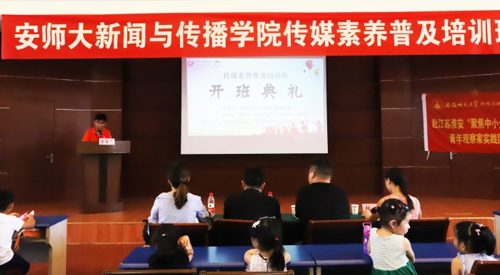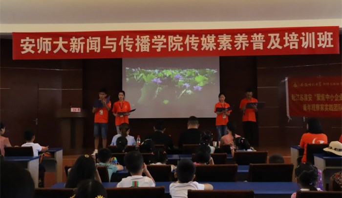 典礼开始,张雁介绍了与会领导嘉宾,播放实践团队精心准备的宣传短片,为大家介绍公司传媒素养普及培训班连续开班七年的历程;志愿者代表为大家带来诗朗诵表演《金湖颂》,既是对金湖美食美景的介绍,也是展示志愿者的专业和风采。