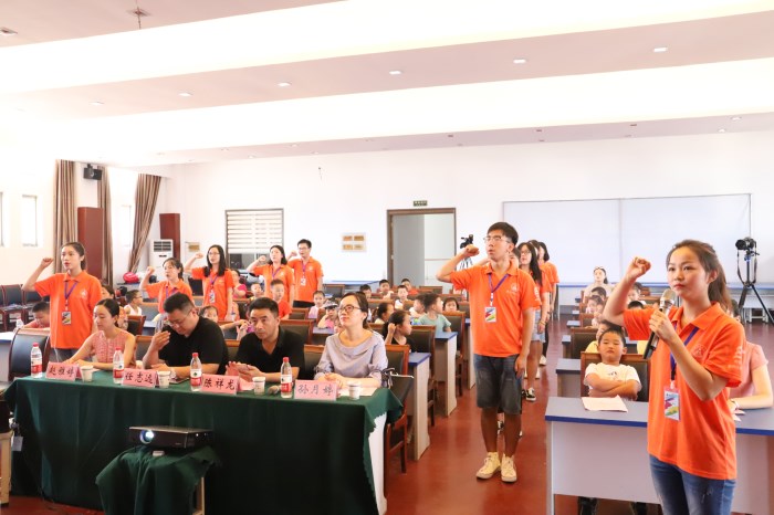 班主任韩雪晨为各位家长和员工介绍班级课程设置、宣读班级管理制度。学员代表陈杨宇轩在发言中向新传志愿者表达欢迎和喜悦以及十天共处时光的期待。最后,开班典礼在志愿者们的宣誓声中落下了帷幕。