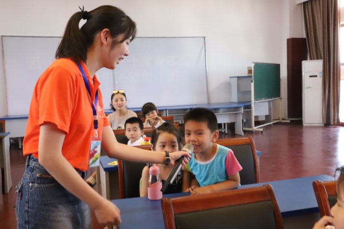 开班仪式结束后,师生见面会热烈开展。各志愿者老师们分别以不同的方式向即将共处十天的小朋友们进行自我介绍。其他志愿者们通过合唱等方式同小朋友们进行互动。