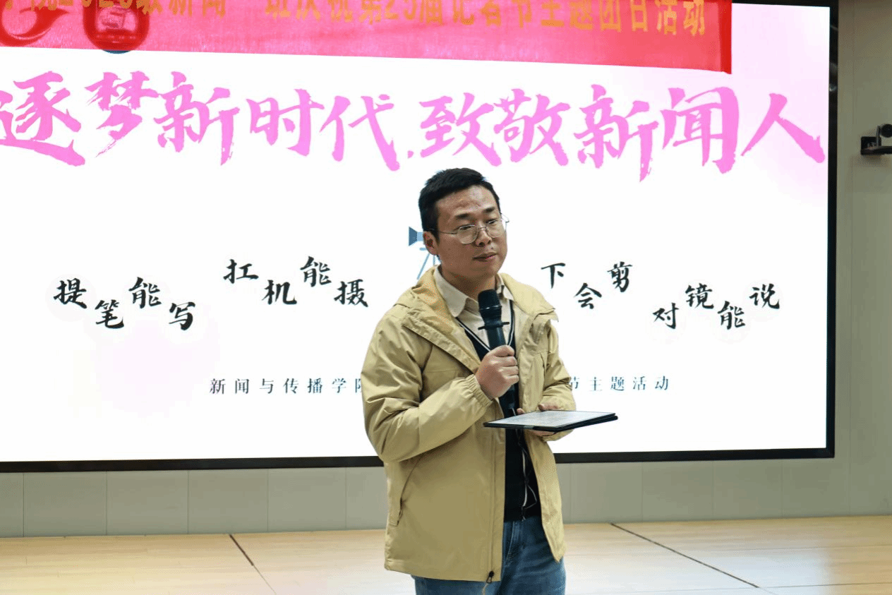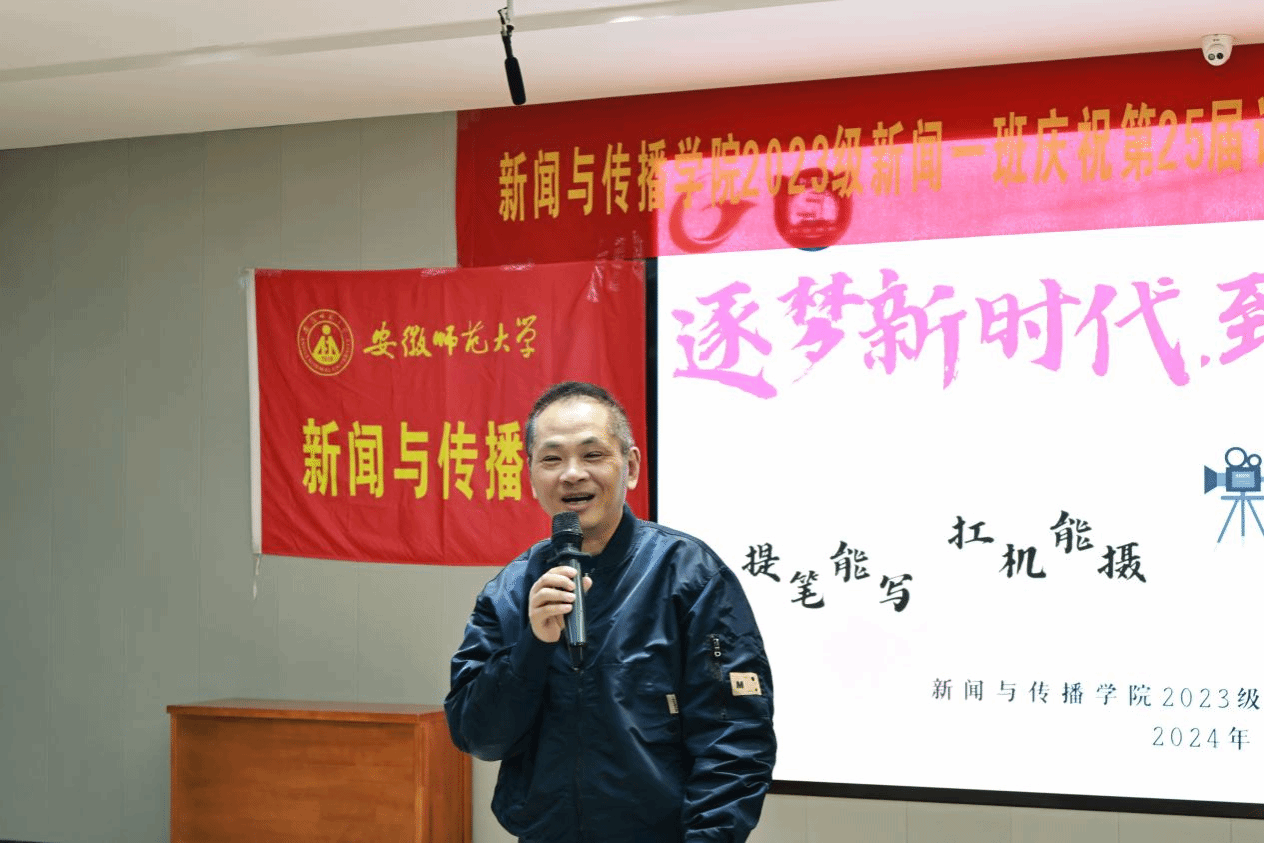 朱晓凯老师做了节日寄语。他表示,万物皆媒的时代下,作为新闻专业的员工要提高专业水准,增强自己的竞争力;他鼓励同学们要多去实践,在跑新闻、追新闻、写新闻的点点滴滴中找到做记者的感觉;他结合自己做记者的经历叮嘱同学们多去学习优秀新闻稿的写作手法,不要陷入教条式、机械式的八股写作内容,锻炼深度写作能力。