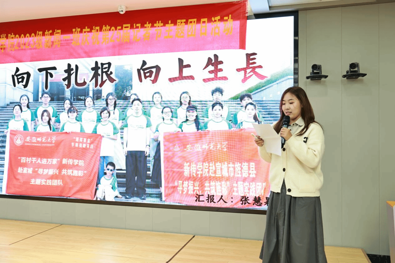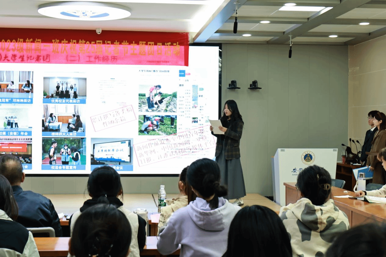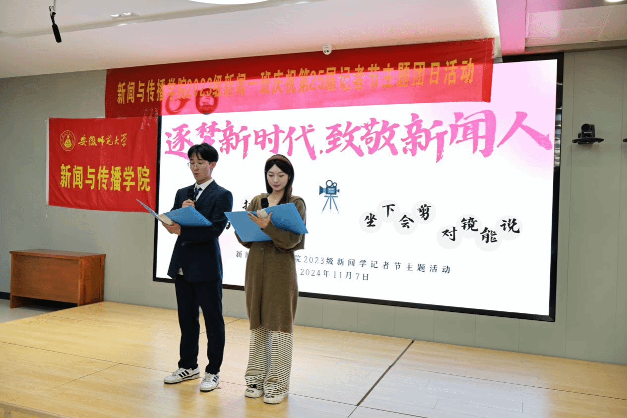 致敬新闻记者,礼赞伟大时代。活动伊始,同学们观看了央视网发布的记者节祝福视频和好记者讲好故事《“枝叶小事”,皆为“头等大事”》,感悟新闻人不忘初心、牢记使命,为正义的事业呼吁,为时代的前行呐喊的精神。紧接着,分别由2022级行政管理专业李家榕和2021级新闻学专业郑雨洁向同学们表达寄语,讲述她们的故事。李家榕重点提到采访提纲以及人物通讯稿的撰写技巧。郑雨洁则以自己的亲身经历讲述如何成为一个有力量的新闻人。同学们积极提问,获益匪浅。