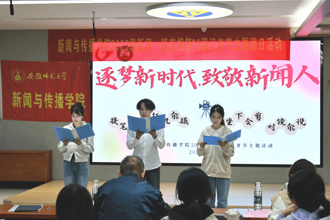 以声传递力量,用音记录时代。本次活动邀请了播音与主持艺术专业的赵思琦、纪思彤、康嘉睿为同学们带来诗朗诵“我是记者”,他们用专业的嗓音、共情的语言向所有奋斗中的记者们致敬。