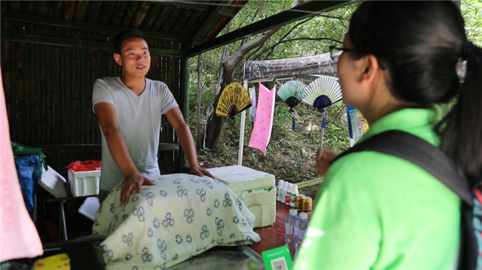 来到峰石俊秀、地貌独特的马仁奇峰,队员们的关注点不仅是雄浑壮丽的景色而是散落在山脚下和登山沿途的大小商户。从特色美食到水果、饮品再到登山装备……这些商铺不仅为当地居民提供了就业和创收的机会,也给八方游客提供了便利。