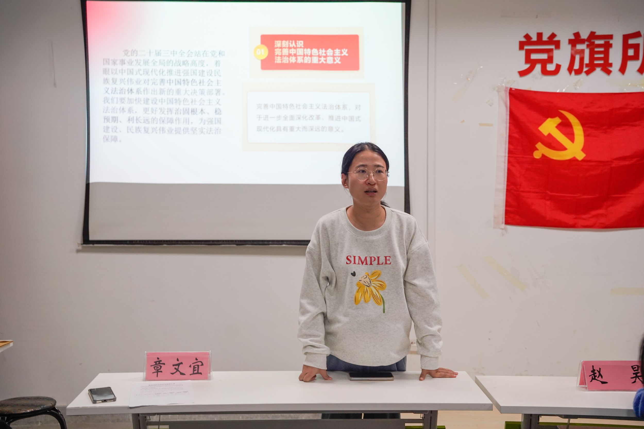 随后,章文宜老师的微党课带领党员们学习了二十届三中全会关于“完善中国特色社会主义法制体系”和“深化体制机制改革”两项内容。全会认为完善中国特色社会主义法制体系对于进一步全面深化改革、推进中国式现代化具有重大而深远的意义。而深化文化体制机制改革也有重大意义,全会提出要牢牢把握深化体制机制改革的基本要求,坚定不移将文化体制机制改革引向深入。