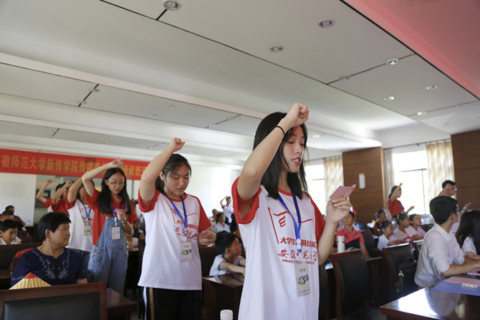 紧随开班典礼之后的是师生见面会,传媒素养普及培训班教师成员整齐站成两列,举起右手庄严宣誓“我愿意成为一名光荣的志愿者,尽己所能,不计报酬”,神采飞扬,赢得现场阵阵掌声。