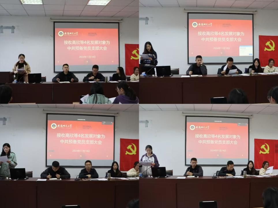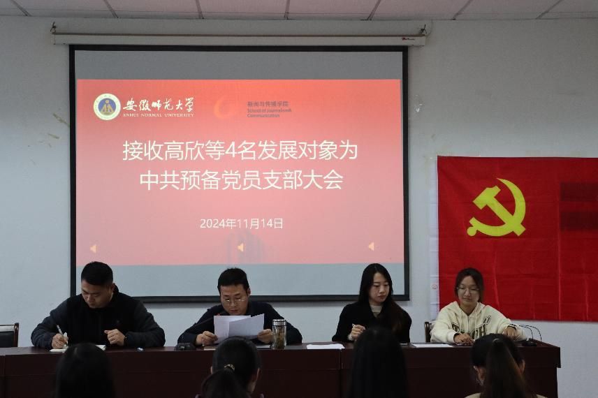 11月14日下午,新闻与播音主持本科生党支部在公司楼四楼会议室召开了关于接收高欣等4名发展对象为中共预备党员的支部大会。支部党员参与会议,2022级和2023级部分入党积极分子列席会议,会议由支部书记马星宇主持。