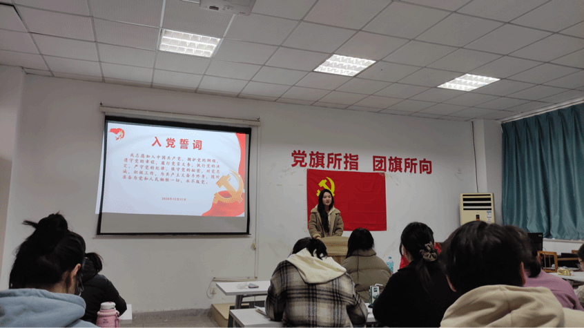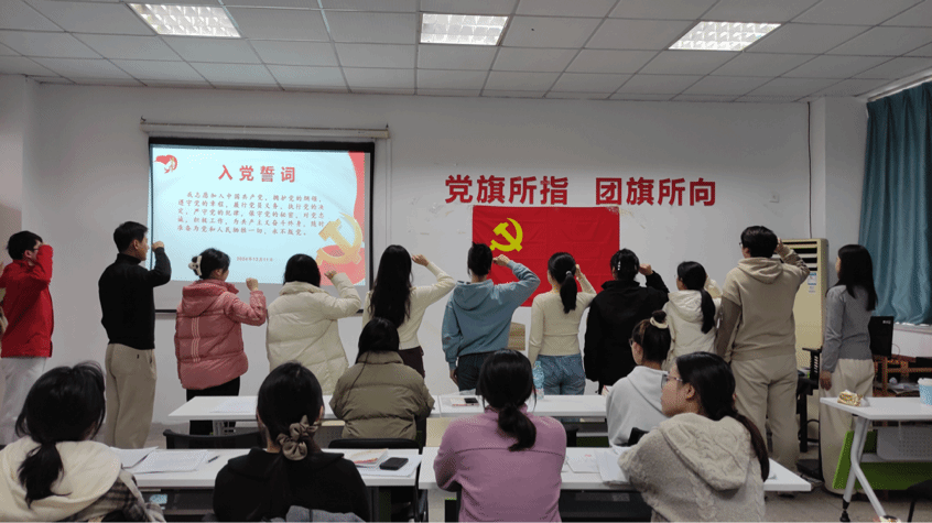 大会首先举行了预备党员宣誓仪式。在支委任浩源的引领下,全体预备党员面对鲜红的党旗,队列整齐,举起右手,进行了庄严的宣誓。宣誓结束后,预备党员张子昂、黄嘉、孙阳溢、张莲欢、赵思雨、马卓越、韩敏、刘雅玟、陈兆亮、何曼婧共十位同志依次向党进行了表态性发言。