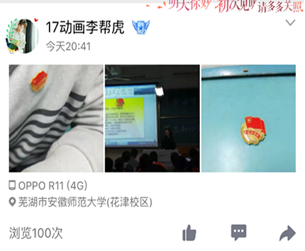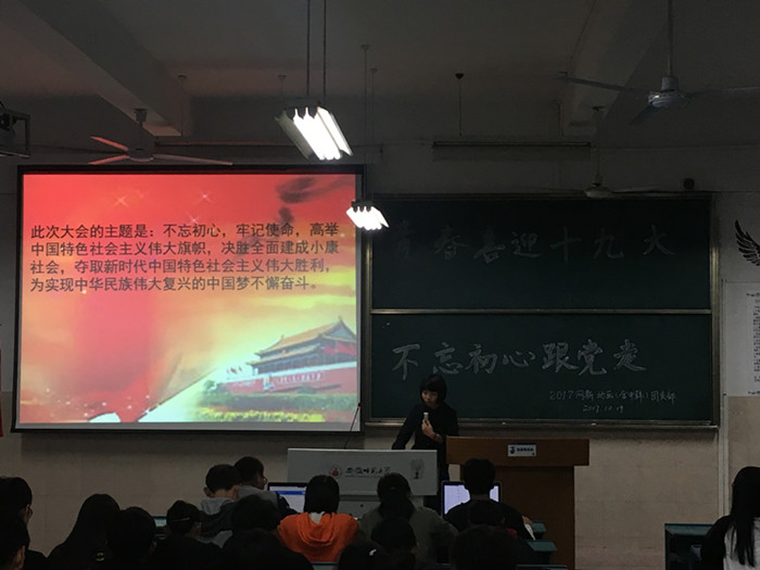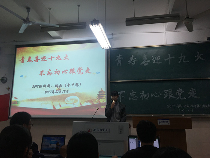 为庆祝中国共产党第十九次全国代表大会在北京人民代表大会隆重开幕,2017年10月19日晚8点,2017级网新动画专业在教室2050302召开“青春喜迎十九大,不忘初心跟党走”主题团日活动。17网新动画(含中韩)全体成员和辅导员张雁参与本次活动,活动由17动画2班秦亚轩主持。