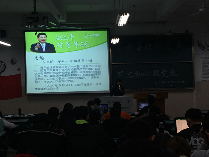 17动画1班刘亦阳带领大家学习了十九大精神,刚刚召开的十九大是在全面建成小康社会决胜阶段、中国特色社会主义发展关键时期召开的一次十分重要的大会。习近平总书记强调了社会主义的主要矛盾已经转变,中国特色社会主义已经进入了新时代,我国将在本世纪中叶建成富强民主文明和谐美丽的社会主义现代化强国,作为青年人任务重大。在习近平总书记讲话的短片中,习近平主席说:“青年是标志时代最灵敏的晴雨表,青年人一定要勇担道义,做社会主义的接班人。”