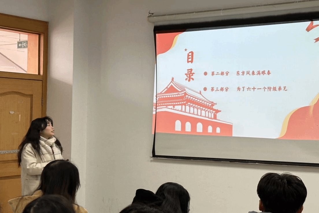 罗思雨同学带大家领读《中国青年报》历史上著名的事件通讯——《六十一个阶级兄弟》,她分别从内容概述、场面描写、文章结构等方面进行剖析,并表示文章采用倒叙的手法,抓住读者的阅读兴趣,营造出一种紧张的氛围。整篇文章结构合理,主题凝练,文章生动有趣。她还现场播放了同名电影的片段激发了参与者的兴趣。