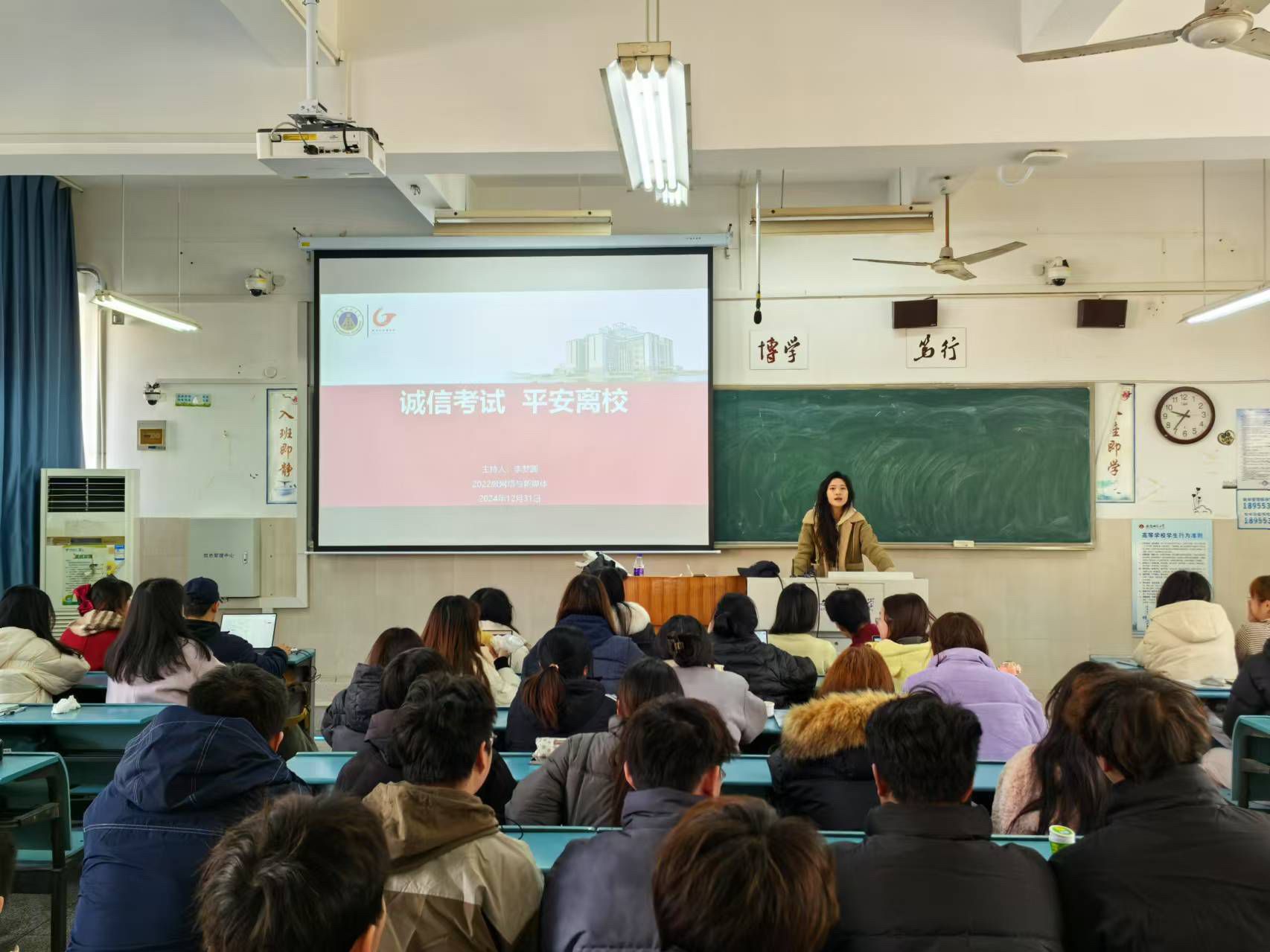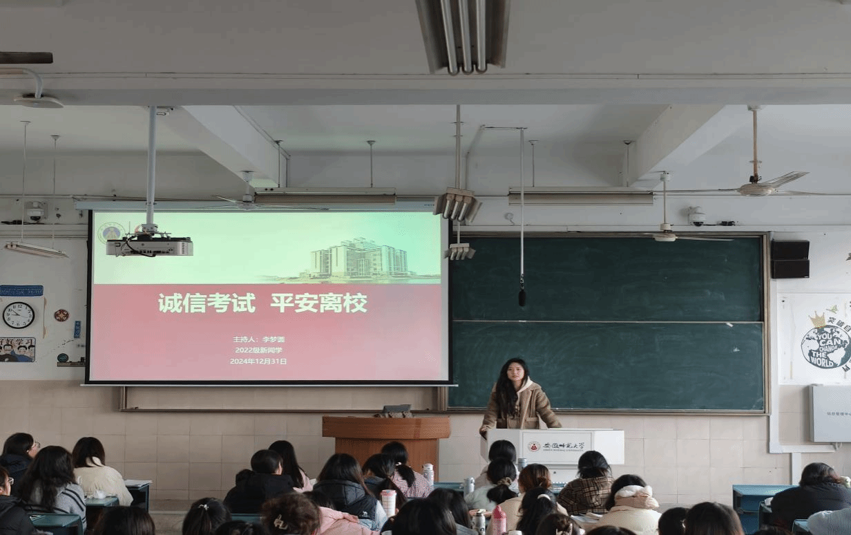 为了营造积极向上的学习氛围,推动期末考试工作的有序开展,同时加强校园安全管理,12月31日,2022级新广网播全体同学在辅导员李梦圆的带领下开展了“诚信考试、平安离校”的主题班会。