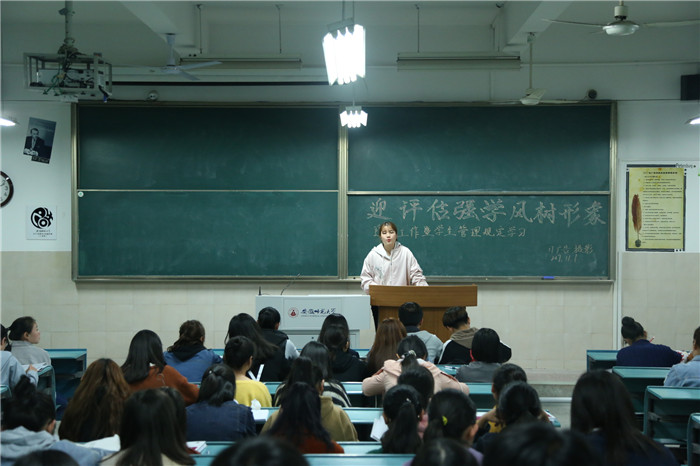 会中,17级摄影副班长丁虹月向同学们介绍了宿舍文明礼仪方面的问题,她分别从宿舍环境卫生、宿舍安全隐患、以及宿舍文化进行讲解述说。其中,环境卫生的整洁度,电器的安全使用,住宿的管理规定这几项更是被特别强调。听完了她声情并茂的解说之后,同学们纷纷表示赞同,同时必会养成良好的生活习惯以配合公司的评估创优工作。